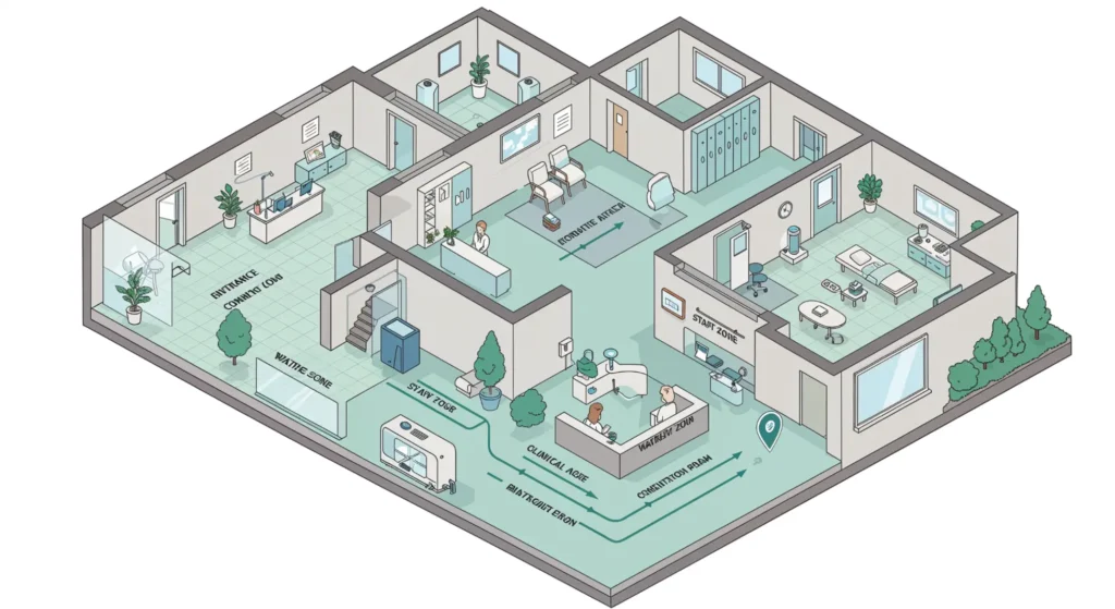 การแบ่ง Zoning ภายในคลินิกเป็นแนวทางสำคัญที่ช่วยจัดระเบียบการใช้งานพื้นที่และลดการไหลเวียนทับซ้อนกันระหว่างผู้ป่วยและบุคลากรทางการแพทย์ แนวคิดนี้มีผลโดยตรงต่อการควบคุมความเสี่ยงด้านการติดเชื้อ เนื่องจากช่วยจำกัดการปะปนของเส้นทางสัญจร รวมถึงเพิ่มระดับความเป็นส่วนตัวให้กับผู้ป่วยในระหว่างการรับบริการ อีกทั้งยังช่วยให้การทำงานของเจ้าหน้าที่มีประสิทธิภาพมากขึ้นจากการลดระยะทางการเคลื่อนที่และความสับสนของ Workflow งานวิจัยด้าน Evidence-Based Design ยังชี้ว่า การแยก Flow ระหว่าง Staff และ Patient อย่างชัดเจนสามารถช่วยลดโอกาสการแพร่กระจายเชื้อภายในสถานพยาบาล และสนับสนุนการดำเนินงานให้เป็นระบบและปลอดภัยมากยิ่งขึ้น