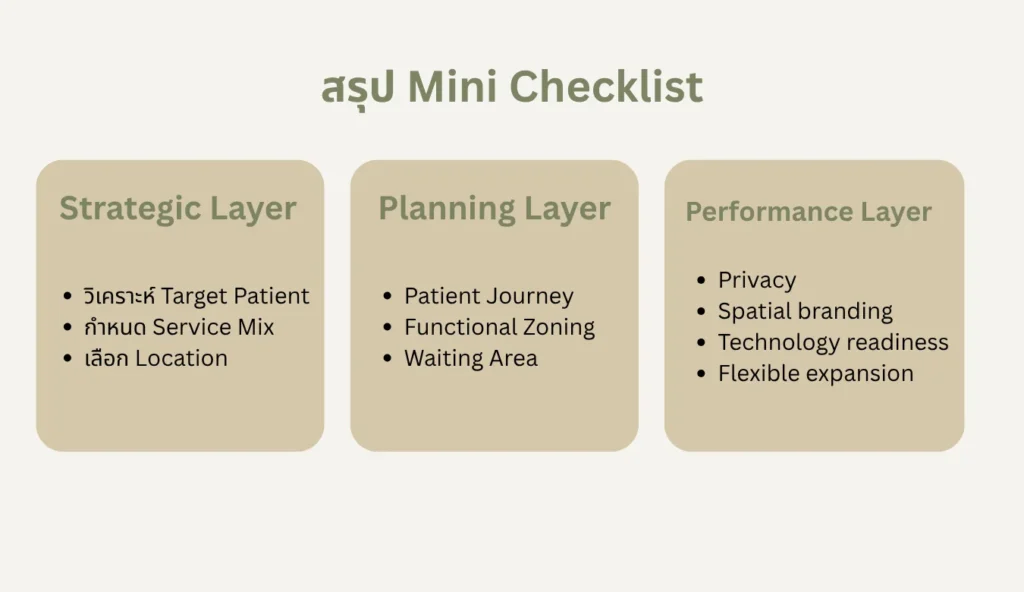 Checklist ก่อนเริ่มออกแบบคลินิกใหม่เป็นเครื่องมือสำคัญที่ช่วยให้การลงทุนด้านพื้นที่และการก่อสร้างเกิดประสิทธิภาพสูงสุด ตั้งแต่การวิเคราะห์กลุ่มผู้ป่วย การกำหนด Service Mix การวาง Functional Layout ไปจนถึงการเตรียมระบบเทคโนโลยีและแผนรองรับการเติบโตในอนาคต เมื่อมีการวางแผนอย่างเป็นระบบ คลินิกจะสามารถสร้างประสบการณ์ที่ดีให้ผู้ป่วย เพิ่มประสิทธิภาพการดำเนินงาน และสร้างผลตอบแทนทางธุรกิจได้อย่างยั่งยืน